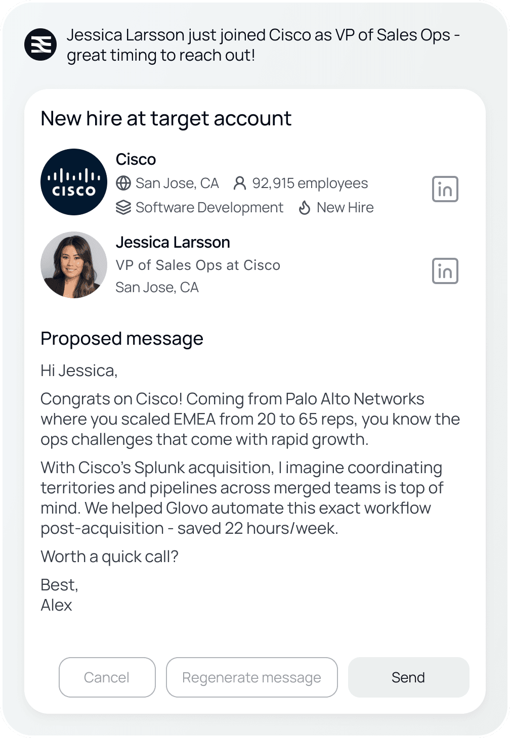 Act on fresh, validated signals in real-time. Track new hires, champion movements, competitor engagement, website visitors, and more.